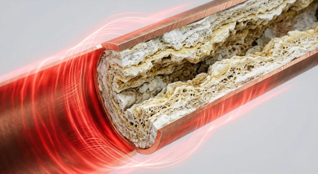 Tačiau kaitinant vandenį, ištirpę mineralai kristalizuojasi tiesiai ant karštų šilumokaičio sienelių. Susidariusių kalkių (kalcio karbonato) šilumos laidumas tėra vos 1,0–2,9 W/m·K. Kalkės veikia kaip tobulas šilumos izoliatorius. Inžineriniai skaičiavimai rodo negailestingą realybę: